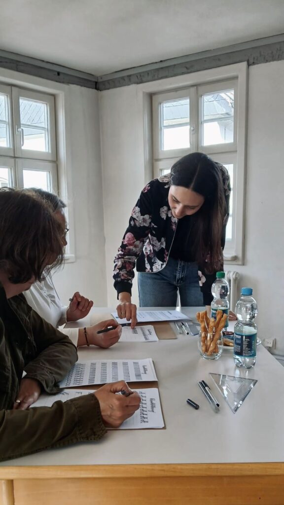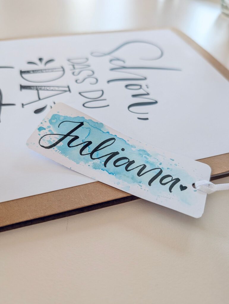 Nach dem Einstieg ging es direkt ans Ausprobieren. Mit verschiedenen Stiften entstanden erste Linien, Buchstaben und kleine Übungen. Schritt für Schritt entwickelten sich daraus eigene Letterings. Jede Teilnehmerin setzte ihre Ideen um und am Ende hielt jede ein ganz persönliches Ergebnis in den Händen.