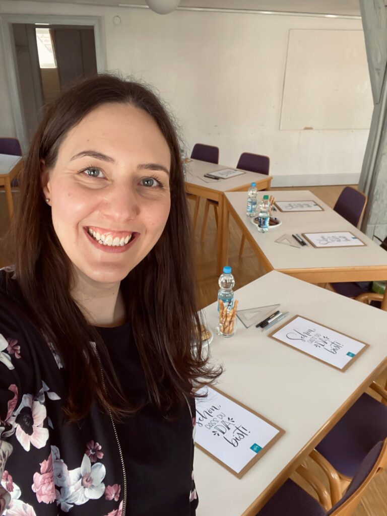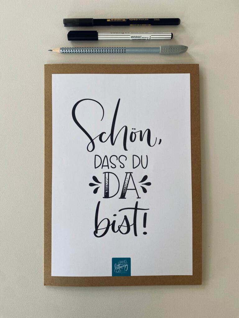 Zu Beginn gab es einen kurzen Einblick in die Grundlagen des Handletterings. Was genau verbirgt sich hinter Begriffen wie Brushlettering, Monoline oder Serifen. Welche Stifte eignen sich für den Einstieg und welches Papier macht wirklich Sinn. Schnell wurde klar. Handlettering ist weit mehr als einfach nur schön schreiben. Es ist eine Mischung aus Technik, Gefühl und ein bisschen Geduld.